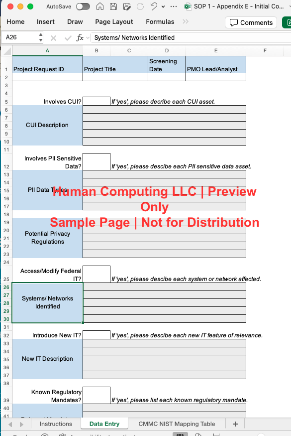 Our templates are built to streamline execution while keeping compliance simple and stress-free. Designed with CMMC standards in mind, they provide the structure you need to meet security requirements without overcomplicating your workflows. CUI is handled securely and only within approved environments, such as customer-provided GFE or designated enclaves, as outlined in the SOW. This ensures your team can focus on delivering results while staying fully compliant with industry and government standards.
